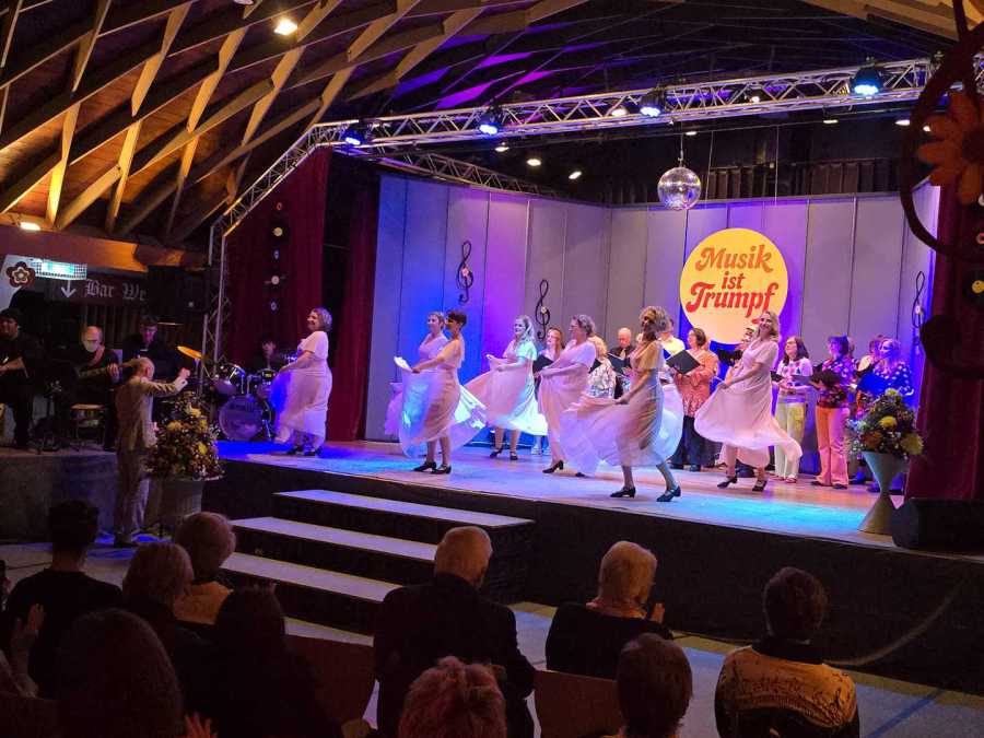 Wie mit einer Zeitmaschine verwandelte sich die Winzerhalle Köndringen am Samstag, 25.10.2025, in ein Wohnzimmer des Jahres 1975 – dem Jahr der Gründung der Gesamtgemeinde Teningen und der ersten Ausstrahlung der Fernsehshow „Musik ist Trumpf“. Die Dekoration u.a. mit Schallplatten und großgemusterter bunter Tapete, die angebotenen damals typischen Getränke und Speisen waren Einstimmung auf diesen Show-Abend. Der Start um 20:15 Uhr mit der Eurovisions-Hymne und dem Intro-Musik-ist-Trumpf des veranstaltenden Chores Quintessenz zusammen mit dem „Fernsehballett“ in schwingenden rosafarbenen Kleidern rief beim Publikum freudiges Raunen hervor. Die Chorliteratur des Abends stand ganz im Zeichen der 70er Jahre und wurde präsentiert von Chören aus vier Ortsteilen: Sing4Fun aus Teningen, dem Gemischten Chor Nimburg, dem Männerchor Heimbach sowie der Jugendformation Jukeboxx und Quintessenz vom ausrichtenden Verein, welche von einer vierköpfigen eigens zusammengestellten Band begleitet wurden. Dazwischen gab es einige Überraschungen, wie eine nicht ganz ernst gemeinte Verlosung und das Solo „Du hast den Farbfilm vergessen“ – ein damaliger Hit in der DDR - der Moderatorin Corinna Keßler. Des weiteren sorgten die schwungvollen Tanzeinlagen des JubiläumsTanzEnsembles zu Medleys von Boney M. und Dieter Thomas Kuhn für Stimmung. Diese kam zu ihrem Höhepunkt, als die befreundete Chorformation „Clé de Soleil“ aus Teningens Partnergemeinde La Ravoire ihre französischen Chansons darbot, schließlich gemeinsam mit Quintessenz. Zum finalen „Musik ist Trumpf“ kamen noch einmal alle Akteure auf die Bühne; es bildete den (vorläufigen) Abschluss eines – wie danach aus dem in Erinnerungen schwelgenden Publikum zu hören war – kurzweiligen und sehr gelungenen Abends.